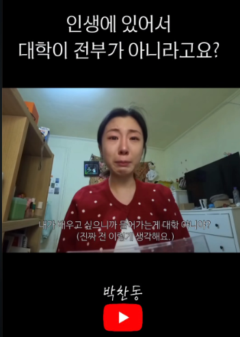 우연히 알고리즘을 통해 만났던 한 유튜버 분의 절규가 제 마음에 인상깊게 박혀 레터에서 꼭 다뤄봐야겠다 생각했는데요. 다소 심한 비속어들이 중간중간 섞여있긴 하지만, 그래서 이 시기 청춘들이 느끼는 날 것의 감정이 생생하게 전해지는 듯한 영상이에요.😔 (한 번 보고 오시면 오늘 레터 내용이 더 잘 이해되실 수도 있어요!) 영상을 보며 저는 “나는 정말로 배우고 싶은데 대학교에 갈 수 없는” 현실에 같이 화를 내고, “지금 당장 저한테는 대학이 인생에 전부인 것처럼 느껴진다”는 말에 격하게 공감하기도 했어요. 여전히 한국 사회에서 ‘대학은 전부가 아니다’라는 말은 너무나 피상적이에요. 이렇게나 대학을 권하는 아비투스가 자연스럽게 형성되어 있으니까요.