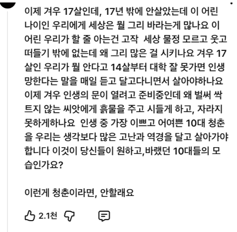 다음 사진은 ‘그냥 다 끝내려고’라는 제목의 플레이리스트 영상에 한 학생이 달아놓은 댓글인데요. 이 영상에는 “원래 미래가 궁금했었는데 이제는 무서워”, “어른이 되면 지금이 제일 행복했다는 걸 알게 될 거라는 말이 너무 역겹습니다.” 등 다른 댓글도 많았는데, 입시 경쟁에서 불안과 우울을 품고 사는 청소년들의 언어가 무지 시리게 느껴져서 가져와봤어요. 행복보다 좌절을 먼저 배우는 청춘들은 좋은 어른이 되기도 전에 이미 마음이 시들어버리고 말아요.🥀 어떤 이들은 어른이 되지 못한 채 영원한 별로 남기도 하지요. 즉, 현재 우리 사회의 교육 시스템은 기어코 좋은 어른을 길러낼 수 없어요. 획일화된 삶의 방식은 모두에게 꼭 들어맞을 수 없고 누군가에게는 그저 괴롭기만 할 뿐이니까요. 그렇기에 좋은 어른을 길러내기 위해서는 다양한 삶의 방식을 존중하는 사회 분위기가 자리잡아야만 해요. 단순히 대학교를 졸업해서만 멋진 어른의 모습을 기대해볼 수 있는 게 아닌, 그 누구든 자신만의 고유한 경험이 인정받고 당당하게 살아가는 사회에서야 비로소 우리는 서로를 구원할 수 있을 거에요. |