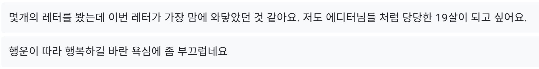 → 🍀: 이 부분도 가능하다면 올해 안으로 레터에서 소개해볼 수 있도록 노력해보겠습니다 (❁´◡`❁) |