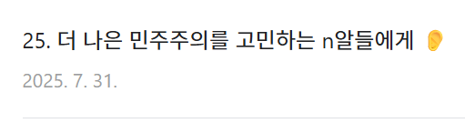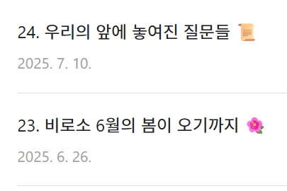 이렇게 약속문이 만들어졌어요!🥳🥳 2025년에 발행한 총 19편의 레터를 훑어보면서 약속을 만드니 올해가 정리되는 느낌이 들어요. 이 약속문을 마음에 새기며 내년을 더 잘 살아갈 수 있겠다는 기대도 들고요. 아래 소통창구에 둥지님들이 직접 의견 남겨주시면 소중히 반영하여 다음 발행일에 최종 약속문을 공표할게요.